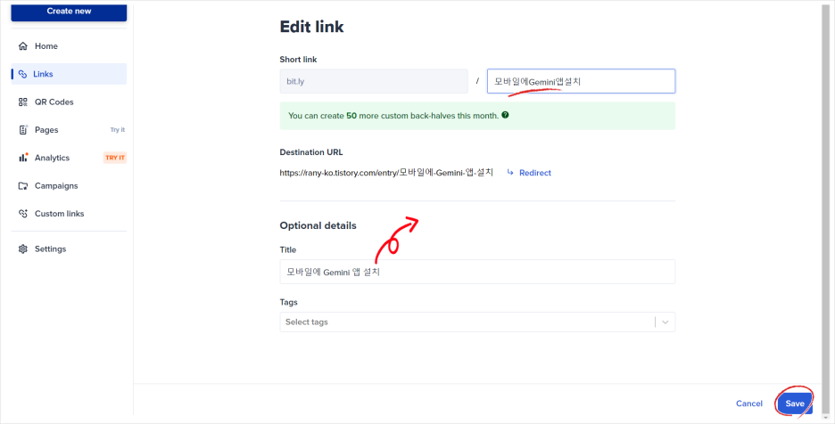 ▶ bit.ly 뒤의 주소를 내가 원하는 텍스트로 입력 - 하단의 Save 클릭
