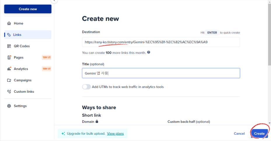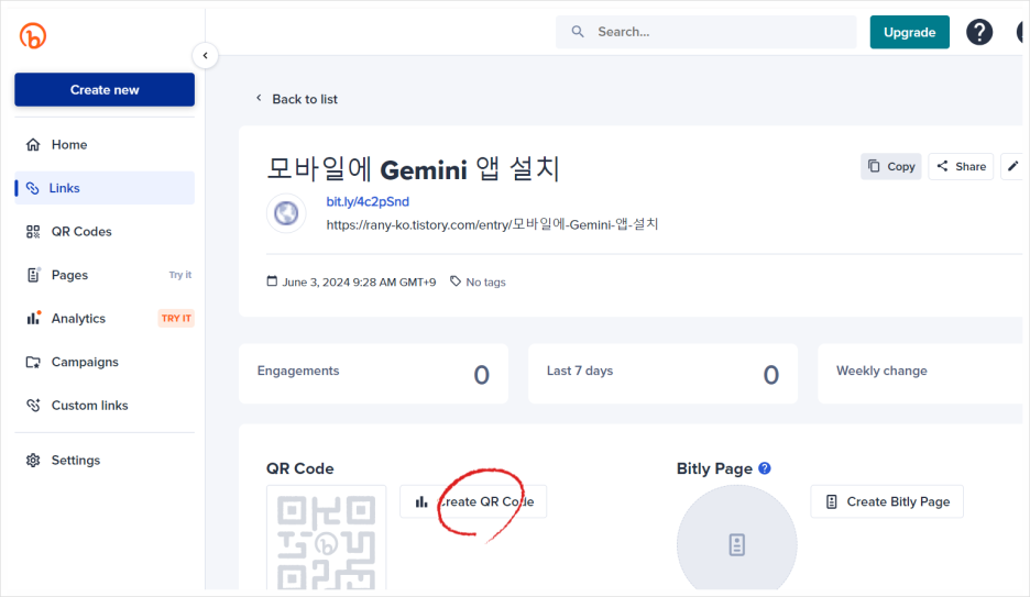 ▶ 단축 url 하단에서 Create QR Code 클릭