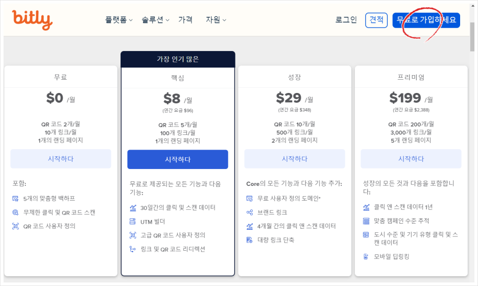- 요금제 - 무료로 사용시에는 링크 줄이기는 월 10회, QR 코드는 월 2회 생성할 수 있다.